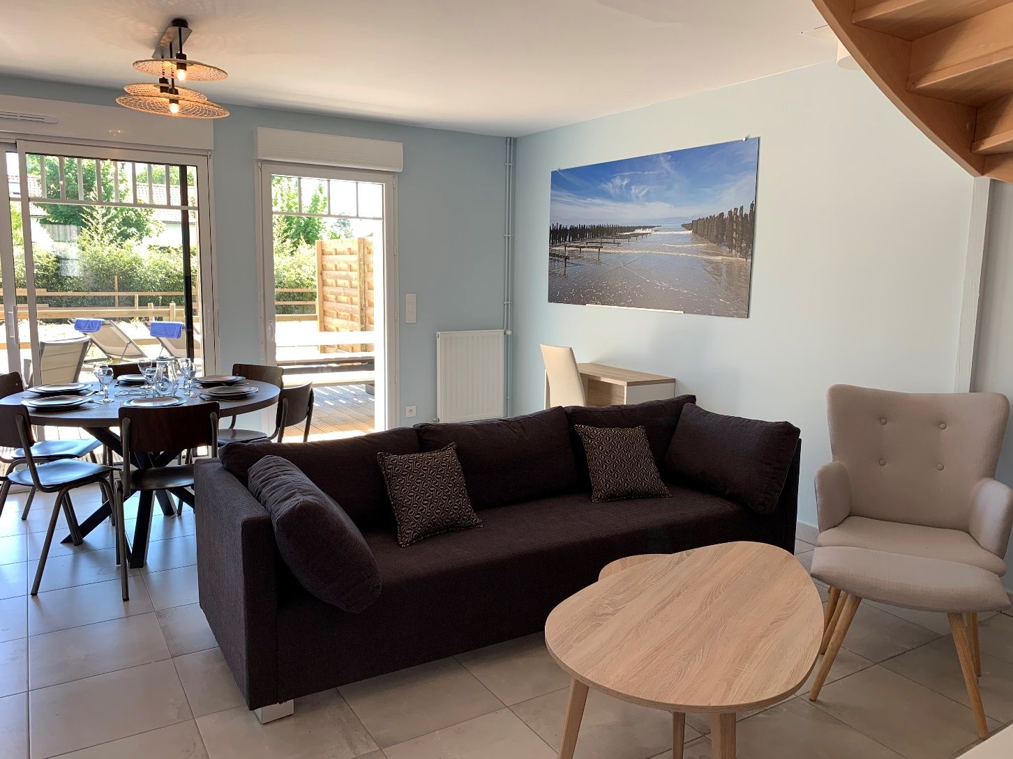 Toutes les chambres se situent à l’étage avec une salle d’eau. Au rez-de-chaussée, vous disposerez d’une deuxième salle d’eau, ainsi que d’un large espace ouvert donnant sur une très belle terrasse bois équipée de bains de soleil, et de fauteuils de jardin.